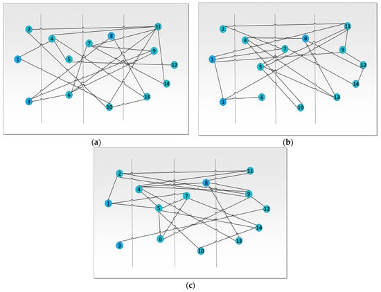 Samples of the NSF network random implementation with 14 nodes, 21 edges, and mean degree of 3. (a) Random network sample 1, (b) Random network sample 2, (c) Random network sample 3.