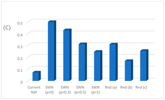 Along with the shortest average path, small-world networks with p = 1 have a high node clustering coefficient. The clustering coefficient indicates how good a node is connected to its neighbors’ neighbors. A high clustering coefficient indicates that the network comprises of many strong ties. Table 1 defines and demonstrates how the node’s clustering coefficient can be calculated. If the node’s clustering coefficient is 1, the neighbors of that node are fully connected, and when the neighbors are poorly connected, the value of the clustering coefficient will be near 0 [6]. Results illustrated in Figure 7 demonstrate a 246% increase in the clustering coefficient when compared with the current NSF design.