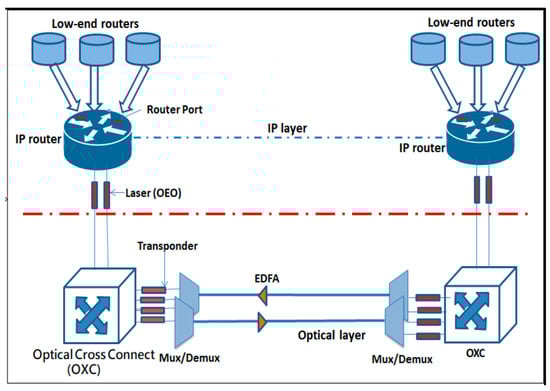 The IP over WDM backbone network as described in [1,13] and illustrated in Figure 8 is composed of two layers: an IP layer and circuit-switched optical layer. The IP layer includes the IP routers, and the transparent optical layer consists of the optical switches (OXC), multiplexers, transponders, erbium-doped amplifiers (EDFAs), and regenerators. The two layers are interconnected through high speed short-reach optical interfaces to facilitate communication between low-end routers. A high-speed optical cable with multiple fibers is employed for interconnecting optical switches, with each fiber associated with two wavelengths for multiplexing and demultiplexing. The OXC is a preconfigured cross-connect system that is capable of inter nodes switching functionality. A pair of transponders are also employed for converting an O–E–O (optical–electrical–optical) signal at the switch node during transmission. For long distance transmission, erbium-doped fiber amplifiers (EDFAs) are used to facilitate transmission for 80 km and provide 30-dB amplification gain to the signal [blackout resilient network]. Regenerators are an essential part of the IP over WDM network and are responsible for restoring the signal strength. A regenerator receives the optical signal, converts it to an electrical signal, removes unwanted parts, and converts it back to an optical signal for forward transmission. Finally, the electronic IP router connects the low-end routers with the OXC switches and is mainly responsible for traffic aggregation between the metro and core networks [13].