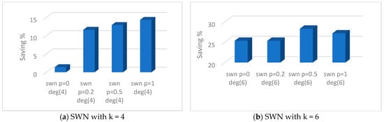 Figure 11 illustrates the SWN with k = 6; it is observed that it is possible to further reduce power consumption to 28% if the average nodal degree is increased from 4 to 6. It is also notable that with the increase in k, the network diameter is decreased, and power consumption of the network can be reduced as traffic can be groomed on fewer links and underutilized resources can be put on sleep mode. Figure 12 presents the saving percentages that can be achieved for the different rewiring probability with k = 4 and 6, respectively.
