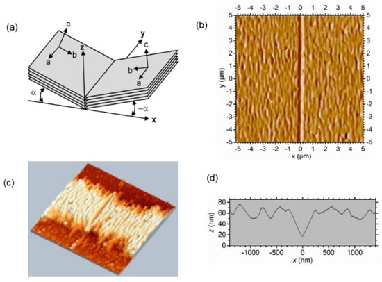 We fabricated thin-film bridges across the bicrystal interface using PMMA-based UV lithography and etching in 0.1% Br/ethanol. Figure 1c shows a topographic image AFM of a 5 μm wide YBa2Cu3O7−x bridge fabricated across the bicrystal boundary on a SrTiO3 substrate. The combination of two profiles of a thin-film bridge, measured across the bicrystal boundary in the middle of the bridge and the bridge outside the bicrystal boundary, gives the cross-section z(x) in Figure 1d, where the level z = 0 is the substrate surface. The V-shaped surface profile of YBa2Cu3O7−x near the bicrystal boundary has slopes at an angle of ±12° to the substrate surface. Growth islands in both electrodes form terraces with a step height of 5 ÷ 20 nm. One can see from Figure 1d that the average thickness of the YBa2Cu3O7−x thin film, except for the bicrystal boundary, is (65 ± 10) nm, and the film thickness at the boundary is about 20 nm.