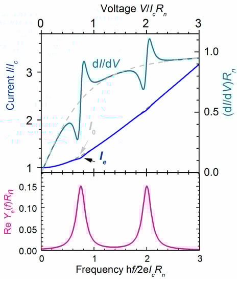 Figure 2 shows how the I–V curve changes with a hypothetical external admittance Ye(f). The presence of two weak absorption lines in ReYe(f) at dimensionless frequencies f1/fc = 0.75 and f2/fc = 2.0 (bottom panel) leads to the corresponding two dips in the dc I–V curve at dimensionless voltages V/IcRn = 0.75 and 2.0 (top panel). The difference between the I–V curve (Ie, blue curve) of the JJ under shunting by the admittance Ye(f) and the autonomous curve (I0, dashed grey curve) is small and localized at the voltages V1,2 ≈ hf1,2/2e (see Figure 2). It is advisable to measure the derivatives of the I–V characteristics to improve the signal/noise ratio, as in other types of tunneling spectroscopy [35]. Indeed, the differential conductance dI/dV vs. V (a dark cyan line) demonstrates two odd-symmetric features of extended amplitudes but the effect of the external admittance on the I–V curve is considerably smaller.