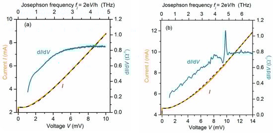 where Ic is the critical current, and Rn is the normal-state resistance of JJ. The deviation of this I–V curve (Equation (1)) from the I–V curve of the JJ in the normal state, Iq(V) = V/Rn, is due to the time averaging of Josephson voltage oscillations V(t) with an amplitude of 2IcRn and the Josephson frequency fj = 2eV/h.