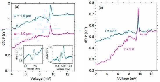 Dependences of differential conductivities dI/dV on voltage V: (a) for two JJs of different widths w at temperature T = 5 K, where the insets show enlarged features at 7.4 and 11.8 mV for the JJ with w = 1.5 μm; (b) for the JJ with w = 1 µm at T of 5 K and 42 K. Sample yd501282 on a 2 × 11.3° bicrystal NdGaO3 substrate.