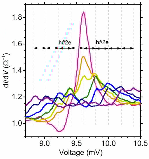 The results are presented in Figure 5 for the dependence of the differential conductance dI/dV on the voltage V for one of the JJs. The unperturbed differential conductance dI/dV vs. V (red curve) has a peak at V = 9.6 mV. With a monotonous increase in radiation power, which corresponds to a decreasing the attenuation of a precision rotary-wave W10 attenuator from 60 dB to 4 dB, the dependence of dI/dV on the voltage V changes (see a corresponding set of curves with colors from red to purple). The main peak at 9.6 mV gradually fades to zero (blue curve) and reappears (navy and purple curve). In this case, additional local maxima show up, which are symmetrically situated from the main peak at V= 9.6 mV by ±194 μV (yellow curve). Then, the satellite peaks also appear at ± n × 194 µV with n = 2, 3, 4 (light blue, navy, and purple curves). The separation of these satellite peaks from each other and the main one is a multiple of 194 μV. This value is equal to the value hf/2e at a frequency f = 94 GHz, and not hf/e, as it could be if the cause of the formation of a feature in the I–V curve is the inelastic tunneling of quasiparticles [35].