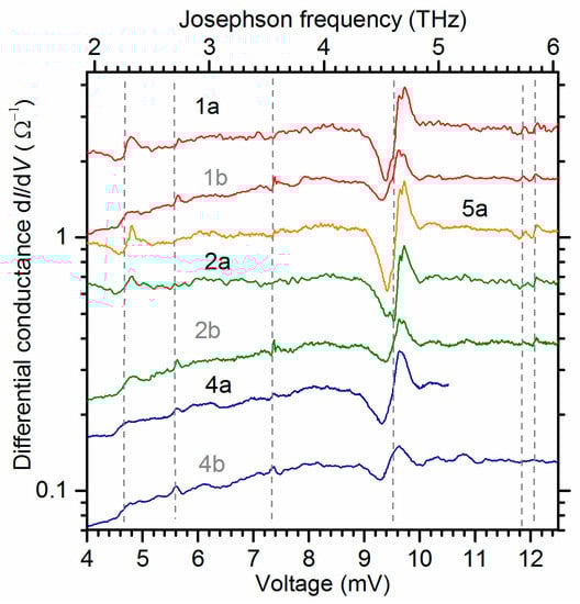 In connection with this circumstance, one should consider the frequencies of optical phonons or, more generally, collective modes in the JJ material itself, YBa2Cu3O7−x. In this case, one should foresee that the oxygen concentration in the electrodes adjacent to the structural barrier of the JJ could decrease during the preparation of the JJ. This circumstance, in turn, can affect the position and shape of the features on the I–V curve of the JJ. To elucidate the effect of oxygen on the voltage position of features on the I–V curve, we measured several JJs as fabricated and after additional low-temperature annealing in atomic oxygen. Figure 6 presents the results, where the numbers on the curves correspond to the JJ numbers on the same substrate, and the letters “b” or “a” correspond to the junction state: b—before low-temperature annealing (before), a—after this annealing (after). As follows from Figure 6, annealing in atomic oxygen leads to a close to a twofold increase in the conductance 1/Rn of the JJs, an enhancement of the features around 9.4 mV and 4.7 mV, and a weakening of those at around 7.4 mV and 5.6 mV.