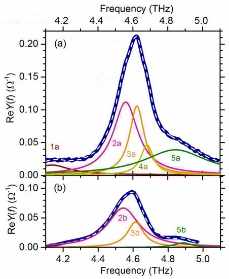 As a first step in this direction, the admittances ReY(f) near the intensive mode at around 4.6 THz were recovered from the experimental curves dI/dV vs. V according to the procedure described in Section 2.2. Figure 7a shows the recovered ReY(f) of the JJ (1a in Figure 6) after low-temperature annealing in atomic oxygen, while Figure 7b shows that before annealing (1b in Figure 6). The maximal value of the admittance ReY(f) after annealing is twice as high as the same value before annealing. The forms of these absorption lines are asymmetric and different.