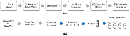 (a) Traditional methodology for long-term open-pit mine planning. (b) Correlation methodology for scenarios matrix. The phase sequence is defined as scenarios and ramp variations in the operative design.