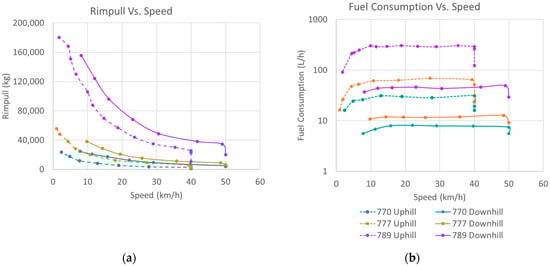 A more detailed description of how the information was extracted from the rimpull curves can be found in each manufacturer’s catalog. Figure 5a shows the information in terms of rimpull and speeds for each selected truck, where logically the larger trucks have greater load capacity, thrust, and higher maximum speeds. One limitation is that all trucks will reach a maximum speed of 50 km/h [41].