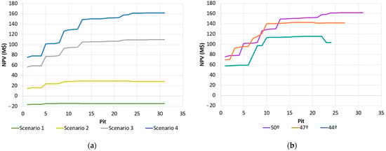 (a) NPV based on annual production variation; (b) NPV based on the variation of the final slope angle in Scenario 4.