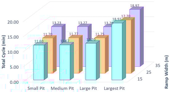 The total cycle estimation (loading time + transport time) of the scenario matrix (Figure 9) was obtained using the speed information according to the rimpull’s truck, considering the truck’s maximum load, ramp slope, and minutes required in each loading stage. For the small, medium, and large pits, there were no significant changes since the equipment maintained a similar range of maximum speeds and the final distances did not vary much. However, there was an increase in the cycle time in the largest pit (30–36%), and this is quite logical because when contemplating another geological body, haulage distances and transport times would increase. The fact is that these distances would be affected if it was decided to vary the slope of the ramp. If the ramp slope was increased, the distances would be shortened, but trucks will not necessarily get there faster, since the speed would decrease [22]. Another important fact that has not been considered is the time required by trucks to arrive at a stockpile or dump site, where the destination site could be further away. Therefore, the cycle could be considerably higher, especially in large pits.