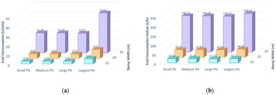 Considering the great importance of these parameters in decisions such as the purchase of equipment in a mining project, this type of analysis should be carried out preliminarily, considering equipment availability, prices, road characteristics, regulations according to the current laws of the site, and the environmental impact. The uncertainty lies in whether it is necessary to purchase more units of equipment to meet production targets or whether the environmental cost of large equipment in terms of fuel consumption, with the associated emissions, must also play a role in the decision-making from a holistic perspective. Subsequently, Figure 12 shows the ratio between fuel consumption (liters/hour) and operational productivity (t/h). This ratio allows for a deeper understanding of energy consumption. Fuel consumption per ton doubled in larger trucks and as the pit size increased. In other words, the environmental cost per ton mined doubles when larger trucks are used.