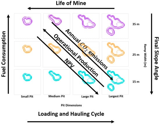 The scenario matrix (Figure 8) was obtained by combining the geometries of the annual production scenarios with the ramp width variation, which considered the pit dimensions according to annual production on the horizontal axis, from a “small pit” to a “largest pit”, and the mining design from a 15 to a 35 m ramp. The pit designs changed minimally as the ramps became wider. This was because it is difficult to give continuity to a wider ramp, due to it being necessary to smooth the curves for the ramp to fit correctly. In addition, it was observed that the final lengths did not vary when the ramp width varied.