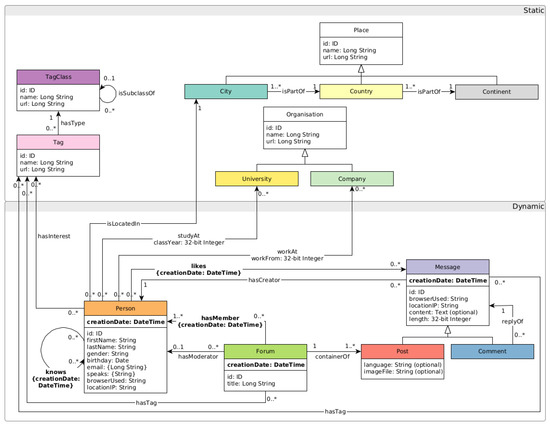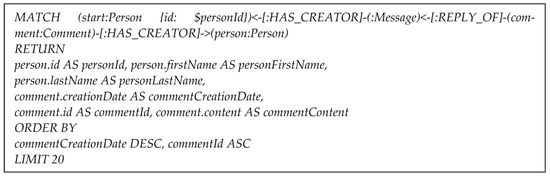 - Angles, R.; Antal, J.B.; Averbuch, A.; Birler, A.; Boncz, P.; Búr, M.; Erling, O.; Gubichev, A.; Haprian, V.; Kaufmann, M.; et al. The LDBC social network benchmark. arXiv 2020, arXiv:2001.02299. [Google Scholar]