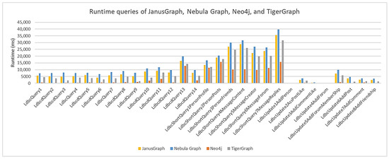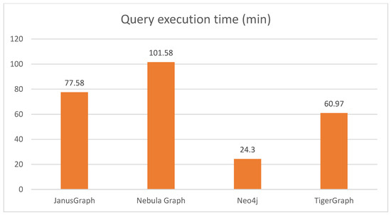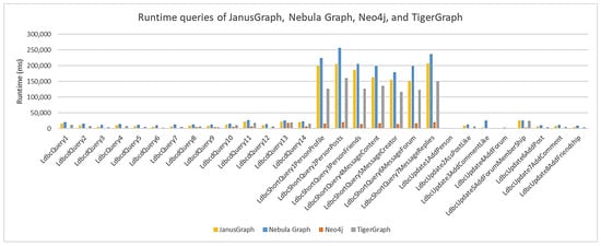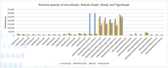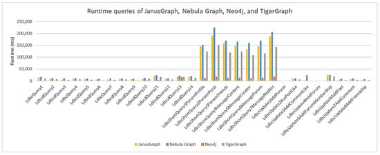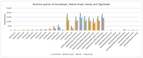 Neo4j had the lowest average node load time, along with higher scalability than the other graph databases. Although TigerGraph has very similar characteristics to Neo4j, it had the second-best average node load time, with lower scalability. The worst-performing databases were JanusGraph and Nebula Graph, with the worst average node load time, and therefore much lower scalability than Neo4j. According to the data presented in Table 2, TigerGraph had a 13% increase in average node load time compared to Neo4j, JanusGraph had a 28% increase, and Nebula Graph had a 42% increase. For each scale factor, 29 queries were executed in each graph database, grouped in three ways: fourteen complex queries, seven more specific and tapered queries called ‘short,’ and eight queries that performed updates.