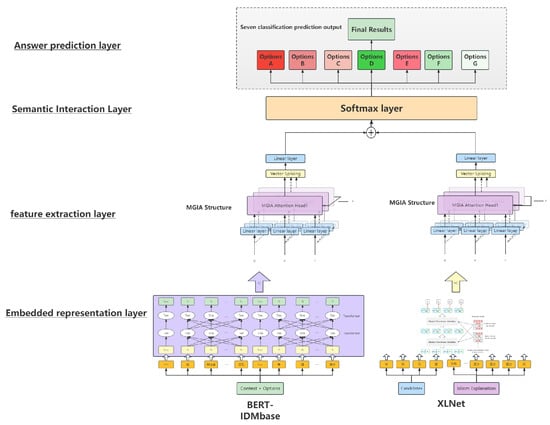 After acquiring the embedding representation of the original input for initialization in the embedding layer, the idioms were encoded from the character level and word level using XLNet and BERT-IDMbase, respectively, potentially introducing the ability to understand idioms in multiple dimensions, while in the feature extraction layer the two input streams were directly feature-extracted using MGIA, the multi-grained integrated attention proposed in this paper. The models in this layer performed multi-granularity inference on top of their respective encoders, which was equivalent to testing two subjects who had learned the language in different ways, both using the same inference paradigm consistent with human thinking patterns to complete the test questions. The multi-granularity inference approach further amplified the differences between the multi-dimensional comprehension modalities in the embedding layer, increasing the model’s potential in terms of multi-perspective reading inference capabilities and generalization performance.