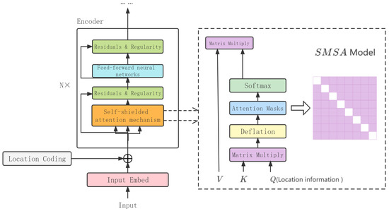 In this paper, the structure of the Transformer is improved, and the self-masked self-attention mechanism (SMSA) is proposed. In the self-attention masking process, SMSA adopts two critical steps to ensure the efficiency and security of a model. Firstly, in the information aggregation stage, SMSA removes the token information in the query vector Q and only retains the positional information. This is because the inclusion of raw content in the query vector Q may cause information leakage and pose a threat to the security of the model. By only retaining the positional information, this situation can be effectively avoided, thereby ensuring the security of the model. Secondly, in the self-attention calculation process, SMSA normalizes the attention weights through a scaling operation and then adds an attention masking matrix to the self-attention mechanism. This attention masking matrix is a diagonal matrix with 1 s on the main diagonal and 0 s elsewhere. Its role is to mask the matrix elements on the main diagonal, thereby shielding the self-information of each vector. This can ensure that when calculating attention weights, each vector only focuses on the information of other vectors, reducing computational complexity and improving the efficiency of the model. At the same time, the introduction of the attention masking matrix can also further ensure the security of the model and avoid interference from the self-information of each vector on the performance of the model. The attention mask pattern is shown in Figure 3. Based on this, the compatibility of the model with multi-layer deep stacking architectures and residual connections was restored by setting up an isolation mechanism for vectors.
