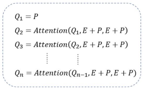 Let the hidden layer of the attention mechanism be represented as . The synthetic vector of input into the feature extraction layer through the embedding layer is represented as , and the computation between the hidden layers is shown in Equation (8).