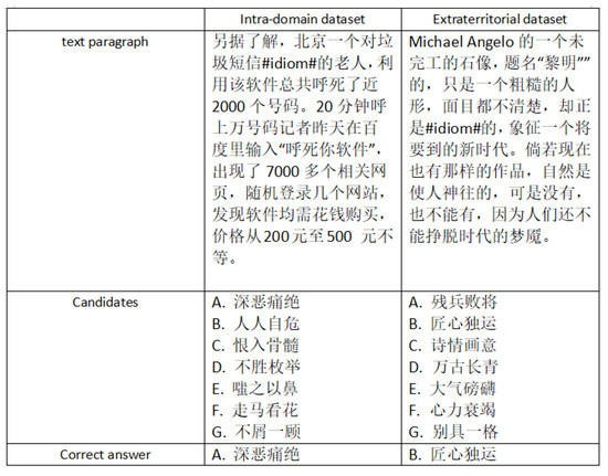 The training, test, and development sets of the ChID dataset all consist of news and fiction stories, while only the extra-territorial dataset includes prose-type passages. This means that the idiom usage in the extra-domain dataset is more stylistically variable and difficult to infer depending on the corresponding literary style of the genre. In addition, the frequency of idioms in the extra-domain dataset is lower than that in the in-domain dataset, and the passages are longer; thus, the idioms in the extra-domain dataset are rarer and less exposed.