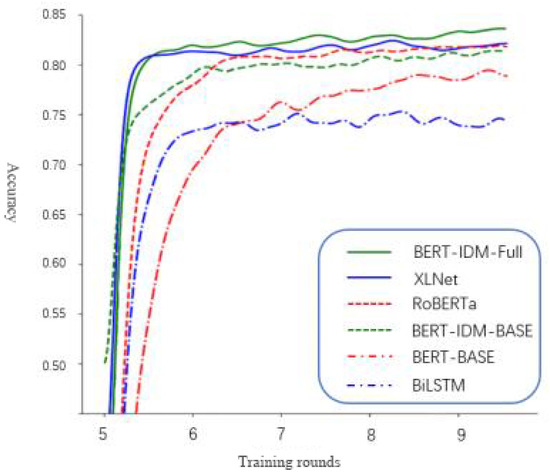 The accuracy convergence between the baseline model and the overall model training in this paper is shown in Figure 8, and by observing the experimental results, it can be found that all models reached convergence before the seventh round of training, the performance of all the large-scale pre-trained models improved, the baseline BERT converged significantly worse because of its lack of language knowledge and ability to process idioms, and the simple Bi-LSTM model converged faster. However, there was a significant performance gap. The overall model in this paper obtained a better convergence speed and prediction accuracy because it could fully parse the idiom structure and obtain knowledge of idioms in the target domain through further pre-training, which proved that the overall BERT-IDM-Full model proposed in this work had better robustness and better performance in reading and understanding idioms.