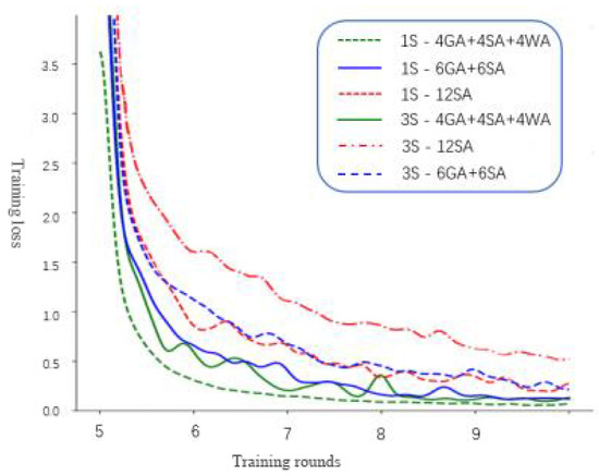 From Figure 9, it can be seen that the final training losses under the step size 3 setting were all greater than when the step size was 1. The MGIA module loss drop for the hybrid attention head mechanism under the single step size setting was smoother, and the accuracy rate corresponding to the combination of loss settings in training was also better, as shown in Table 5, which demonstrated that higher robustness improved performance results and convergence.