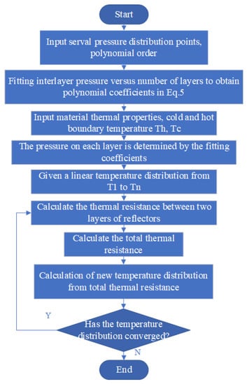 In the classical LBL model, the interlayer pressure is identical to the vacuum chamber pressure. In this study, the modified LBL model is solved by the heat resistance method and the flowchart of the calculation process is shown in Figure 2. The hypothetical pressure distribution is given as the training data for the inversion model. Correspondingly, the reflector temperature of the MLI can be determined, and the residual gas conduction is modified by the pre-given pressure distribution. Therefore, the interlayer temperature distributions corresponding to the pressure distributions can be obtained.