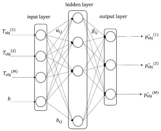 The extreme learning machine (ELM) [] is adopted to implement the reconstructing of the interlayer pressure of MLIs in this study. ELM is a type of feedforward neural network that is characterized by its simplicity and efficiency in training. As is shown in Figure 2, it consists of a single hidden layer with a large number of hidden units, and the weights of the hidden units are randomly initialized and fixed during training. The output weights of the ELM are then learned using a simple linear regression algorithm, making the training process very fast. ELM is particularly useful for tasks that require fast training and prediction times, such as online learning and real-time applications. It has been applied to a wide range of tasks in machine learning, including classification, regression, clustering, and feature learning. One of the key advantages of ELM is that it can learn complex nonlinear relationships in the data without the need for complex optimization algorithms, such as back-propagation. This makes it particularly well-suited for tasks where the data are noisy or have a high dimensionality.