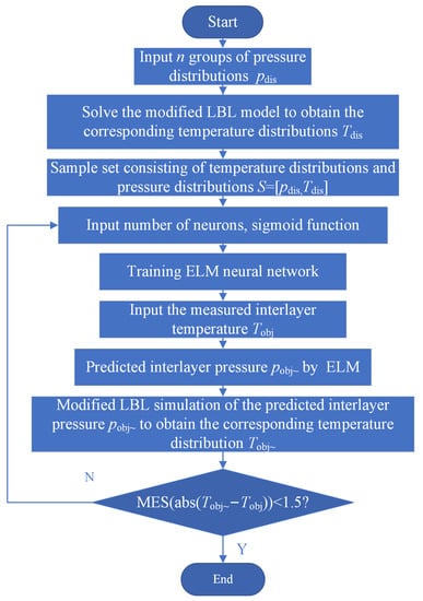 Firstly, give a number of neurons (e.g., 20) and sigmoid function type (e.g., radial basis function), then repeat the training 100 times by inputting the temperature distribution determined by the abovementioned LBL model. A total of 100 pressure distributions are reconstructed by the ELM model. Then, 100 reflector temperature distributions across the MLI can be determined by the modified LBL model. The deviation between and is used as a criterion. When the deviation is less than a pre-defined threshold value, such as 1.5 K, the output result of can be regarded as the reconstructed value. If the calculation cannot be converged in 100 iterations, then the number of neurons is adjusted or the sigmoid function is adjusted to continue training the ELM model. By adjusting the number of neurons and the sigmoid function of the ELM model, the input weights of the ELM are arbitrarily generated. The predicted interlayer pressure distributions are different each time. Therefore, the ELM model will be iterated until the criterion is satisfied. The flowchart of inversion of interlayer pressure using ELM is shown in Figure 4.