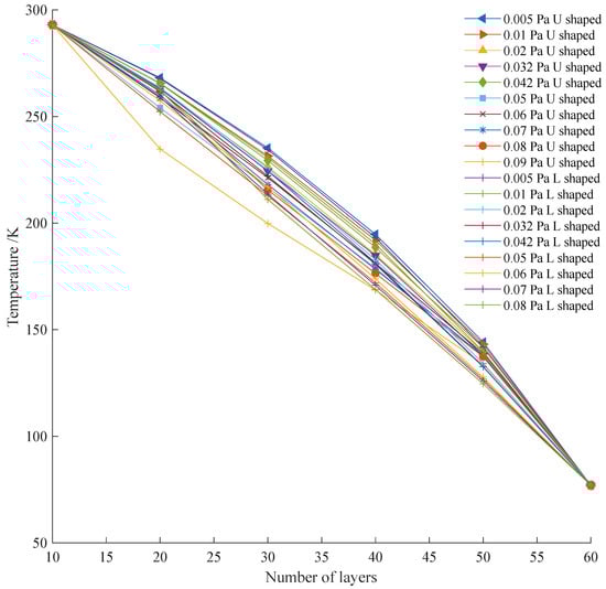 The vacuum chamber pressure is 1 × 10−3 Pa; the sample set contains 20 samples of pressure distributions ranging from 10 to 90 times of the vacuum chamber pressure and includes “” and “L” shaped distributions as shown in Figure 5. Hot and cold boundary temperatures can be adjusted according to the application. The layer temperature distributions corresponding to the pressure distributions are shown in Figure 6.