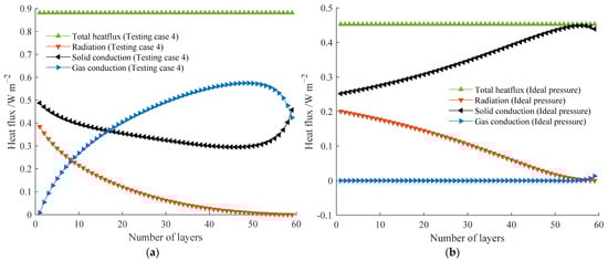 Heat fluxes in the MLI: (a) ideal vacuum condition; (b) testing case 4.