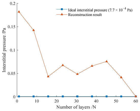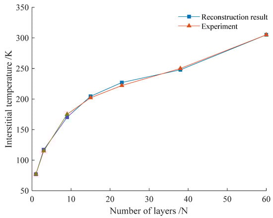 Wesley [] provides an experimental result for the thermal insulation performance of a 60-layer MLI with a double-aluminized mylar (DAM) and Dracon net. The cold boundary temperature is 77 K. The layer density is 9.5 N/cm. The heat flux of the MLI is measured as 0.262 W/m2. Based on the modified LBL model and ELM algorithm, the interlayer pressure is reconstructed as shown in Figure 10. It can be seen that the highest pressure in the MLI is 0.18 Pa near the cold boundary, which is 233-times higher than the vacuum chamber pressure of 7.7 × 10−4 Pa. The interlayer temperature determined by the modified LBL model is highly consistent with the measured temperature as shown in Figure 11.