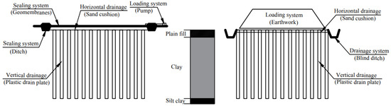 Figure 1 illustrates the schematics of vacuum preloading and surcharge preloading methods. These methods aim to drain the pore water from the ground through a pre-loaded vertical and horizontal drainage system, and as the pore water dissipates, the pore volume of the soil then decreases, consolidation and settlement of the foundation occurs, and the effective stress and strength of the foundation soil gradually increases. The drainage consolidation models of the ground by preloading are presented [9,10,11,12,13].