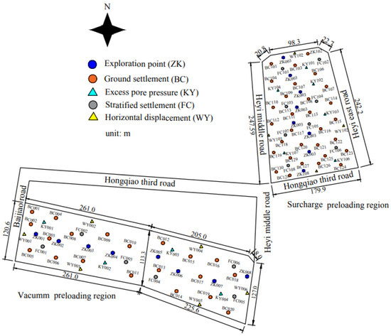During the total period of vacuum preloading and surcharge preloading, various parameters were monitored in the two regions targeted for improvement, including ground settlement, stratified settlement, horizontal displacement, and excess pore water pressure. The number and sequence of monitoring points and holes are tabulated in Table 2, and the layout of monitoring points and holes is plotted in Figure 2. In order to monitor the settlement amount and settlement process of each soil layer and to grasp the deformation of each soil layer under vacuum, ground vertical settlement and horizontal displacement were monitored using a LeicaNA730 balance level with an accuracy of 1.2 mm/km and a LeicaTZ08 total station with an accuracy of 1 s, respectively. In order to monitor the settlement amount and settlement process of each soil layer and to grasp the deformation of each soil layer under vacuum pre-pressure and mound pre-pressure, eight CJY-7090 high-precision stratified settlement gauges with a measurement accuracy of 1 mm were fixed at intervals of 3.0 m in a 24 m stratified settlement tube, respectively, and the stratified settlement of the soil was obtained by monitoring the synchronous sinking amount of the magnetic settlement ring fixed on the settlement tube with the settlement of the foundation. It is worth mentioning that the accuracy of the measurement results is greatly influenced by the selection of the reference point, and it is necessary to ensure that the settlement tube enters the soil-bearing layer, otherwise, the compression and settlement of the soil at the bottom of the tube produces relatively large measurement errors.