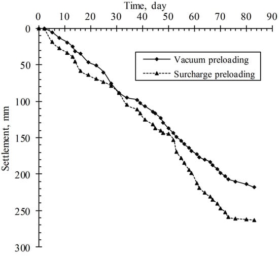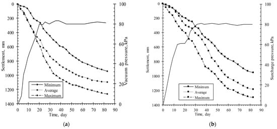 - The primary consolidation settlement () quickly increases up to 90% of the total primary consolidation settlement (), with an increase in the average excess pore water pressures () of less than −40 kPa in vacuum preloading, while it also quickly increases, with the average excess pore water pressures () hovering between 20 kPa and 25 kPa in surcharge preloading.
