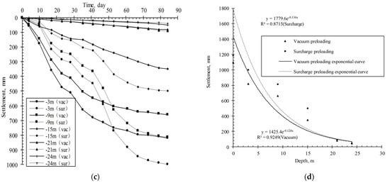 of vacuum preloading and surcharge preloading: (a) distribution of along the depth of vacuum preloading; (b) distribution of along the depth of surcharge preloading; (c) historical curve of vacuum preloading; (d) historical curve of surcharge preloading.