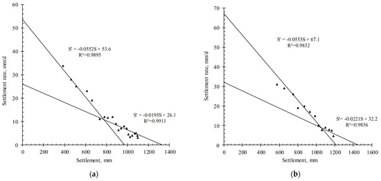 So, during the secondary consolidation stage, the relationship between consolidation settlement rate and the consolidation settlement is also a line with the slope () and intercept (), and and are fitted by the least square method. The final consolidation settlement is presented by: