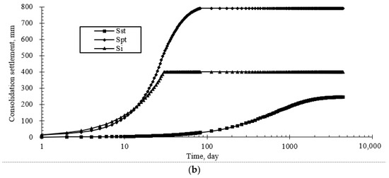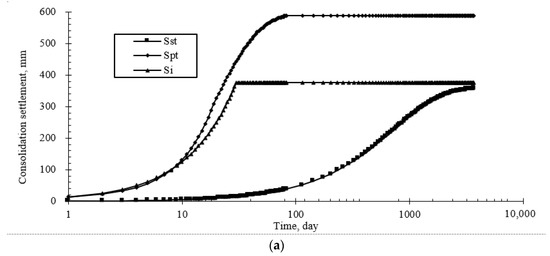 Based on the mechanics of soil consolidation, the ground settlement is composed of instant settlement (), primary consolidation settlement (), and secondary consolidation settlement () caused by creep. Therefore, the final settlement by the consolidation method is presented. The final settlements () of two improved regions are also analyzed by the consolidation model method proposed by: