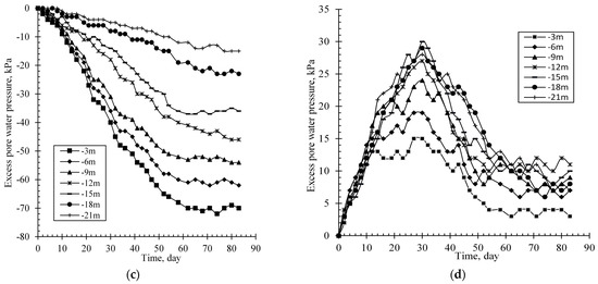 Figure 6 plots the average excess pore water pressures (). As shown in Figure 6, the monotonously increases up to the maximums on the 63rd day, then basically remains stable in vacuum preloading. On the 63rd day, the of vacuum preloading decays linearly from −70 kPa to −10 kPa along the depth of the ground, with an attenuation coefficient of 3.1 kPa/m. The reason for this is the PVDs’s block, bending, and brakeage induced by stratified settlement [6,9,17,31,32,33,34]. The of surcharge preloading reaches maximum on the 30th day, then dissipates up to the minimums on the 53rd day. The of surcharge preloading on the 30th day is piecewise linear along depth, i.e., it increases from 15 kPa to 30 kPa with depth in the range of 3–15 m, and slightly reduces to 27 kPa with depth in the range of 15–21 m. The monotonously increases up to the maximum on the 63rd day, then basically remains stable in vacuum preloading. This shows existents in soil structure compression and stress redistribution during the consolidation process [5].