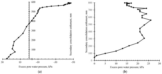 Figure 7 plots the primary consolidation settlement () vs. . The secondary consolidation settlement () during preloading retains a low level, and the effect of on can be ignored. Figure 7a shows that during the vacuum preloading, the obviously increases by 540 mm, equal to 90% primary consolidation settlement, with ranging from 0 kPa to −40 kPa, while it gently increases by approximately 60 mm with over −40 kPa. Therefore, it can be deduced that with −40 kPa is an important value during the monitoring of , in the vacuum preloading. As shown in Figure 7b, during the surcharge preloading, slowly increases with beneath 20 kPa and increases significantly with between 20 kPa and 25 kPa.