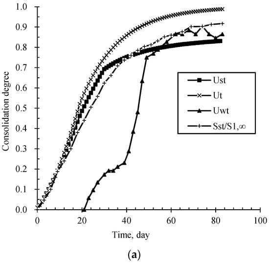 The consolidation degrees denoted as , , , calculated by the consolidation model method [39], and for vacuum and surcharging preloading, respectively, are plotted in Figure 9. Figure 9 shows that in vacuum and surcharging preloading, the , are close to each other within 35 days after preloading, while they deviate significantly after the 35th day. On the 83rd day, the sequence of consolidation degree from the maximum to the minimum is , , . The is less than within 50 days and is relatively close to after the 50th day.