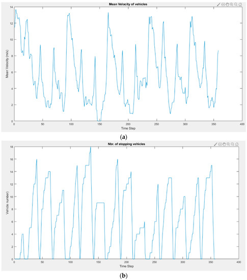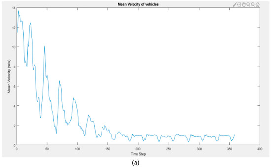 Figure 4a shows the mean velocity of the vehicles on the route when SVM is not implemented. We can observe a cycle of change in the mean velocity. Because of the instruction delivery procedure, the congestion would still be eliminated, but with less efficiency. The mean velocity could be maintained at a high level; the peak value of the mean velocity not using SVM was nearly 14 m/s, while it is a little bit lower when SVM is employed. We can also observe that for a short period of time, the mean velocity dropped to zero, which was not observed in the simulation with SVM.