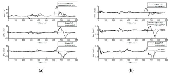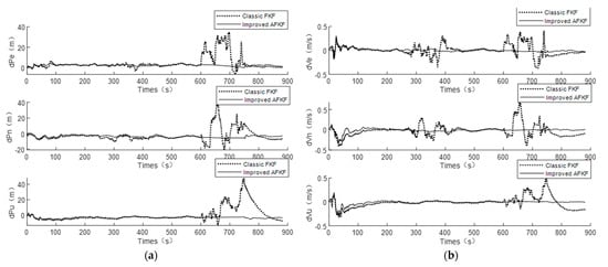 Comparison of navigation errors between improved AFKF and classic FKF: (a) Comparison of position errors. (b) Comparison of velocity errors.