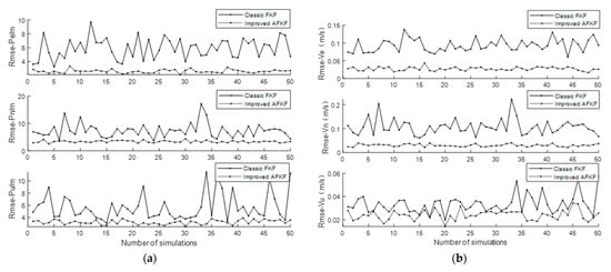 where N represents the experiment time, and and represent the true value and estimated value, respectively, of the state at time step k. The final results are shown in Figure 5a,b. The average root mean square position error and the average root mean square velocity error of the 50 simulation experiments are listed in Table 4.