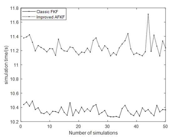 In order to validate the real-time performance of the proposed improved AFKF algorithm, using the same simulation software and platform as described above and with the same raw data, we compared the entire filtering process time between the improved AFKF and the classic FKF in 50 simulation experiments, as shown in Figure 6. The driving time of the unmanned vehicle in the simulation was 887.5 s, with an average runtime of 11.2493 s for the improved AFKF and 10.3526 s for the classic FKF. Although the average runtime of the improved AFKF proposed in this paper was increased by 8.66% compared to the classic FKF, it still met the real-time requirements of the integrated navigation of unmanned vehicles. The filtering cycle of the improved AFKF was 1 s, and the INS update period was 0.02 s. The average filtering time was less than 3.69 ms, which was smaller than the INS update period, satisfying the real-time requirements of the system.