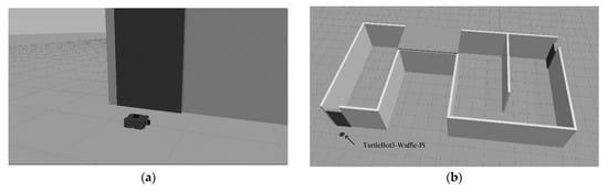 Simulation experiments on the Gazebo platform: (a) Unmanned vehicle model TurtleBot3-Waffle-Pi. (b) Environment for unmanned vehicle travel.