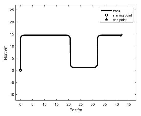 The initial position (local coordinates) was set to , the initial attitude (pitch, roll, yaw) was set to , and the initial velocity (local coordinates) was set to [0 m/s, 0 m/s, 0 m/s]. This corresponded to a simulation of an unmanned vehicle going downhill, uphill, and around corners in an unmanned vehicle trajectory.