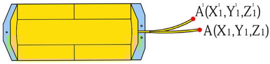 After the coordinate system was established, we used the floating coordinate method to design and analyze it. The endpoint position of the end input tube was point A, and its position in the global coordinate system was calculated using Equation (1), where D is the direction cosine matrix of the relative coordinate system with respect to the global coordinate system; is the position of the input tube endpoint A in the relative coordinate system before deformation; A1 is the position of the deformed input tube endpoint in the relative coordinate system, as shown in Figure 3; is the deformation displacement of the input tube; and R is the position of point A when the input tube is undeformed in the global coordinate system. We then differentiated Equation (1) to obtain the motion velocity of point A, as shown in Equation (3), and differentiated Equation (3) again to obtain the motion acceleration of point A, as shown in Equation (4). The velocity of the plasma bag movement was known, and the time required for the residual-input tube to move without relative displacement was obtained using Equation (5). Once the time ‘t’ was determined, the system calculated the average of the images captured after time ‘t’ to obtain more accurate positional information.