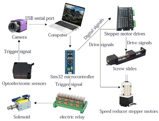 The control system of the residual-input tube-cutting system for plasma bags comprised a computer, camera, Stm32 micro controller, photoelectric sensor, screw slide, stepper motor driver, reducer stepper motor, electromagnet, and serial module, among other components. Its major function was to detect the end position of the input tube by capturing the image of the plasma-bag input tube and controlling the feed and reset of the cutting device driven by the screw slide. The reducer stepper motor drove the plasma bag in a reciprocating cycle of work, ultimately energizing the electromagnet to perform the input tube-cutting action. Figure 5 illustrates the control system of the plasma-bag-cutting device.