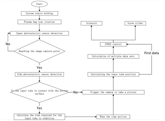 During the operation of the plasma bag’s residual-input tube-cutting system, the bag was positioned on a tray with its input tube facing outward. As the conveying device rotated, the plasma bag passed through an image-acquisition device. A photoelectric sensor on the top triggered the camera to capture images of the plasma bag, while a photoelectric sensor on the side verified the contact between the input tube and the bottom surface. The camera captured 20 frames of images at equal intervals. Upon acquiring the first frame of the image, the image processing program was invoked to compute the position information, which was then communicated to the STM32 via a serial port. The microcontroller governed the movement of the lead screw slide according to the data obtained in the first frame. If the program detected contact between the input tube and the bottom surface, it selected an image sampled at the duration required for the input tube to exhibit no relative displacement, and computed and processed it using the soft body kinematics algorithm. If no contact was detected, the image processing program processed all of the collected images. The averaged processed data were then relayed to the STM32 to control the lead screw slide until it reached the final position. Once the input tube reached the cutting position, the electromagnet energized it to cut it. A flow chart of the system’s operational process is illustrated in Figure 6.