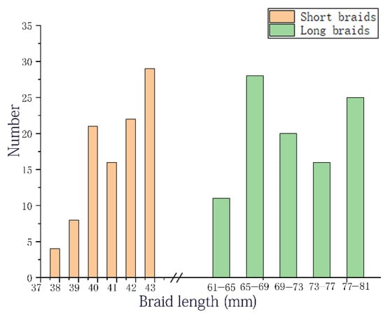 To test whether the system could perform cutting under extreme conditions of the longest and shortest input tube lengths, we conducted other tests. We cut and sealed the input tube at 85 mm and 45 mm for 10 bags of plasma, which were then randomly placed in a freezer. The straight-line distance from the end of the input tube to the edge of the plasma bag was measured, and 200 data points were collected and statistically analyzed, as shown in Figure 7. The results indicated that the maximum radial distance of the input tube was 81 mm, while the minimum was 38 mm, with a difference of 43 mm between the two. The lead screw slide used by the system met the requirements.